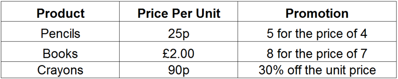 48\times\text{£}2=\text{£}9680 crayons with the promotion of 30\% off the unit price, means the school pays \text{£}0.63 per unit.