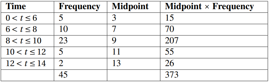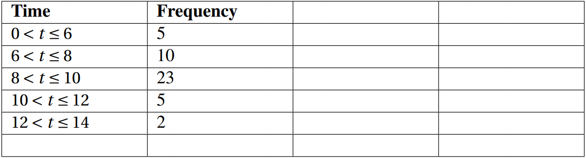 The following grouped frequency table shows the time taken (in minutes) by a class of students to complete a 1500 m race.