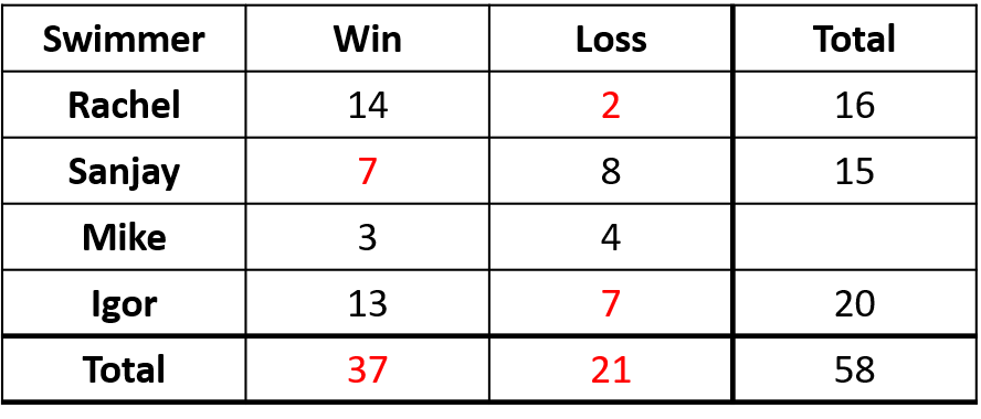 To calculate the win/loss ratio for each swimmer, the table must first be completed. The completed table is shown below: