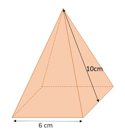 The pyramid below is made up of a square base with side length of 6 cm and 4 identical triangles with height of 10 cm.