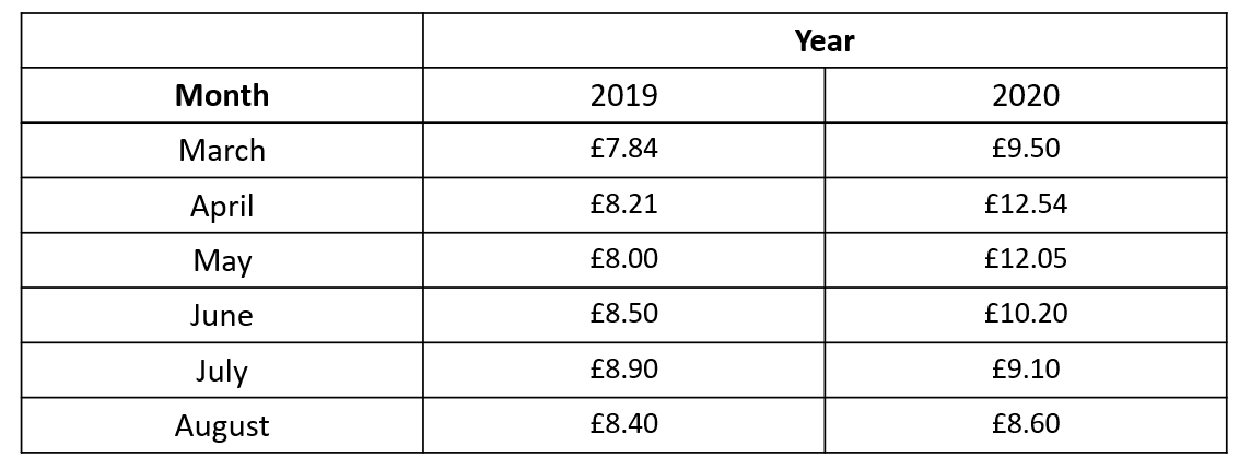 The table below shows the average amount spent per week per household on alcohol in the United Kingdom for the months March to August in 2019 and 2020.