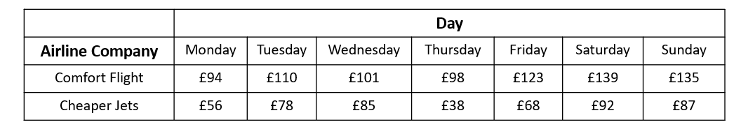 The table below shows the prices of flights to Majorca in a given week for two different airline companies.