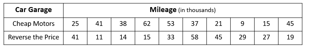 Mean mileage of Cheap Motors =\dfrac{25+41+38+62+53+37+21+9+15+45}{10}=34.6 thousand = 34600.