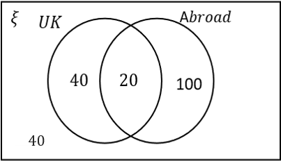 10\% of 200: 0.1\times200=20. So 20 people had a holiday abroad and a holiday in the UK. These people belong in the intersection.