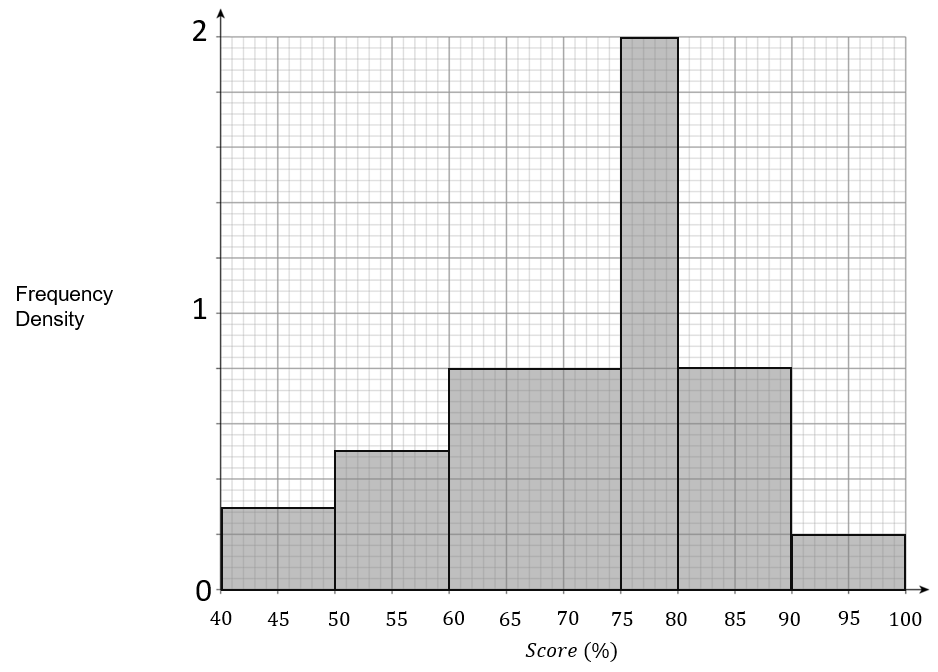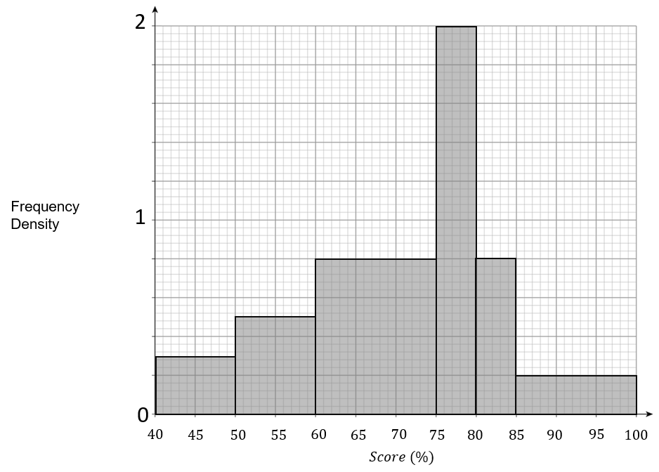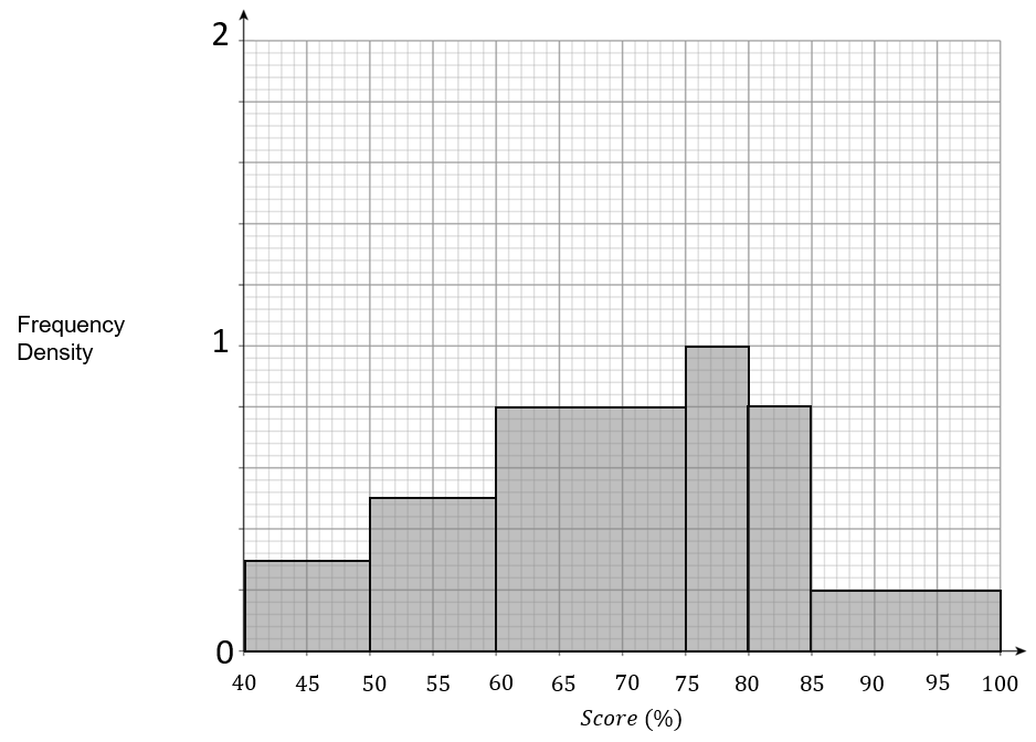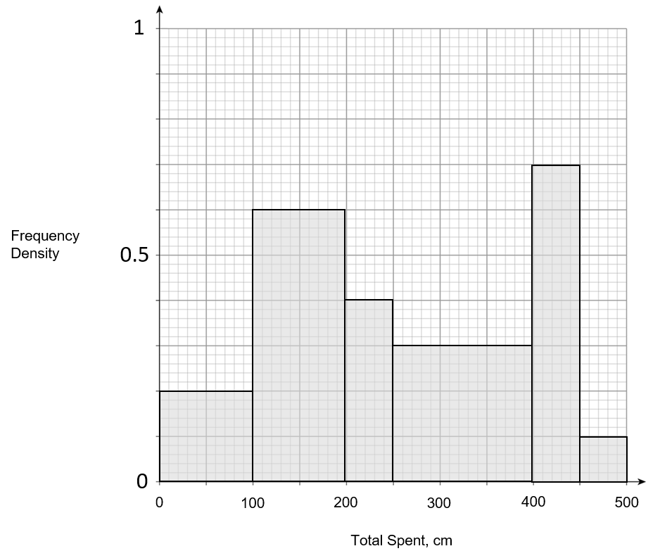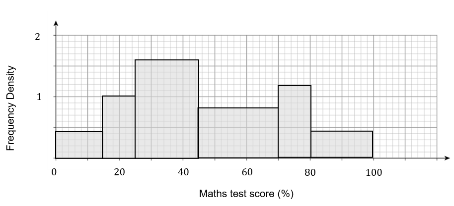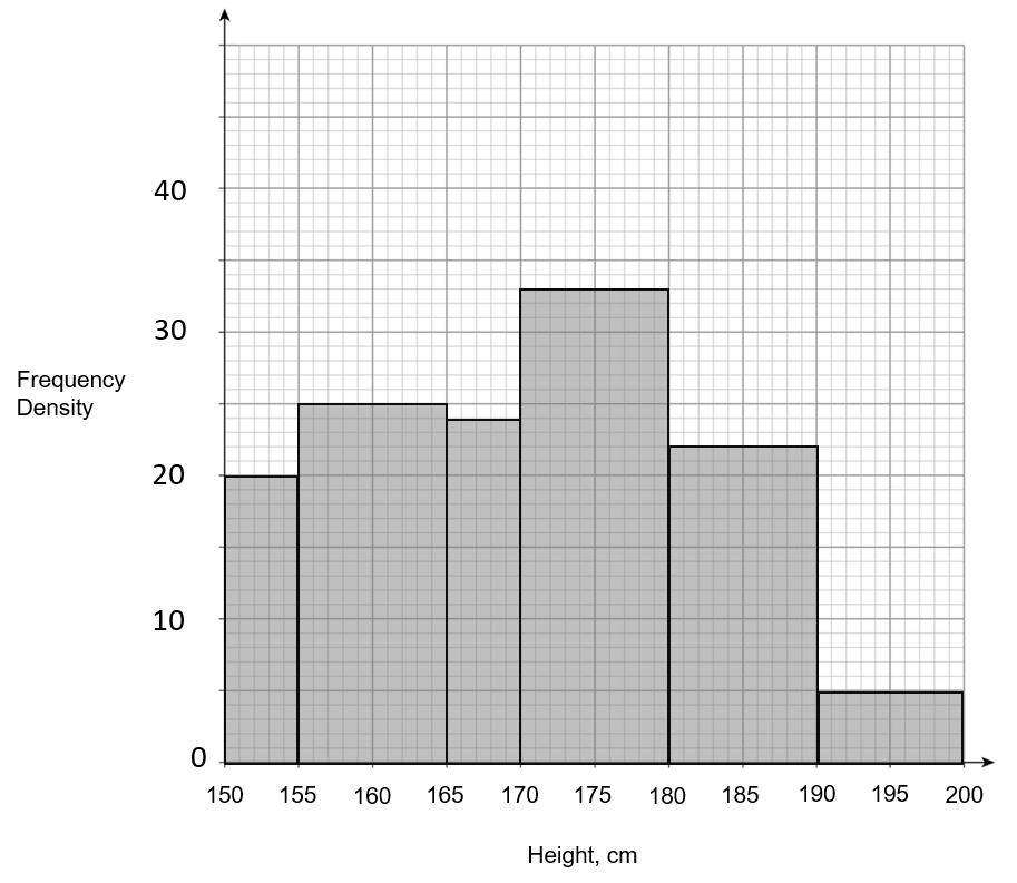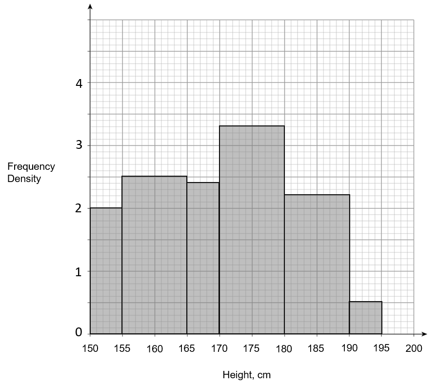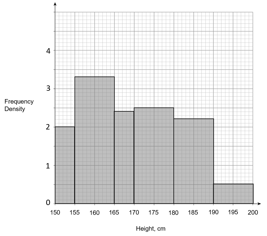 \text{Frequency} = \text{Frequency density} \times \text{Class width}Find the frequency for each of the final three bars and add them up.