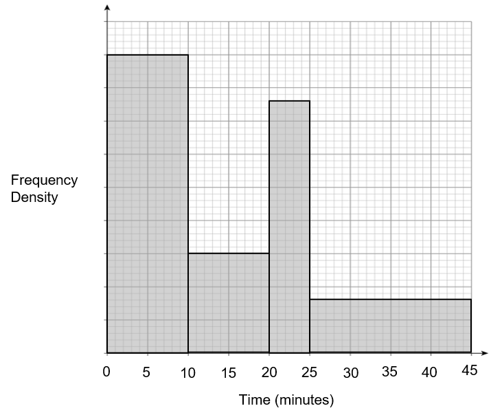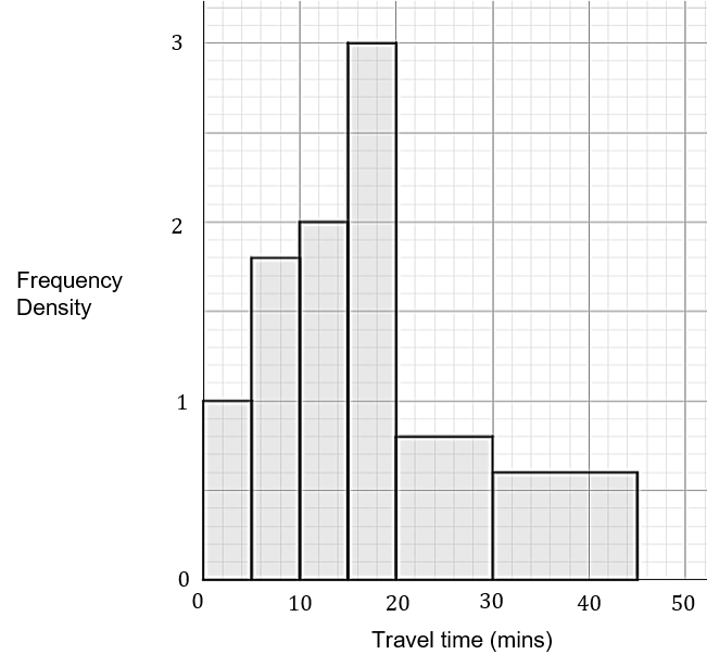 Data on the travel times of students getting to school has been collected and is summarised in a histogram below.