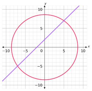 Using the graph, find the solutions to the simultaneous equations represented by the line and the circle.