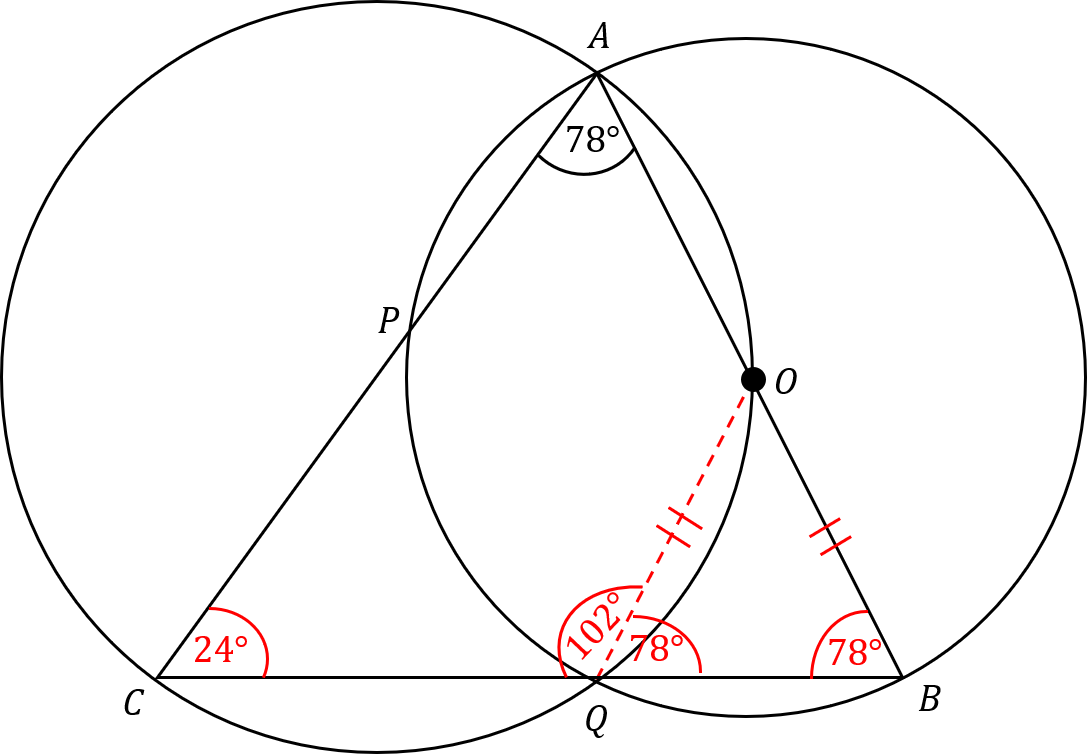 \angle\textit{ACB} = 180 - \angle\textit{CAB} - \angle\textit{OQB} = 180 - 78 - 78 = 24 \degree (Angles in a triangle)